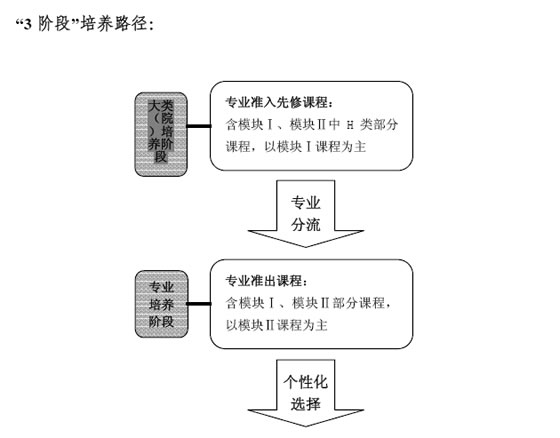 3、专业准入准出分流机制:参照上述《培养路径图》,南京大学本科生培养分为大类(院系)培养、专业培养和多元培养三个阶段,各院系通过制定专业准入准出分流机制实现学生从大类(院系)培养到专业培养阶段的过渡。所谓专业准入,即学生在不同年级分流到某专业的最低先修课程要求,主要以Ⅰ模块课程和部分Ⅱ模块中的H类课程为主;所谓专业准出,即学生从分流专业获得学士学位的最低Ⅱ模块课程要求;在达到专业准出要求的前提下,学生自主选择个性化模块实行多元培养,个性化模块的分类设置取决于各专业培养目标需要,院系可根据自身情况做适当补充或修改;