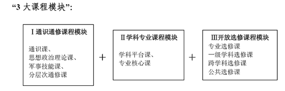 2、必修与必选:150个学分中,学校要求必修的课程为:Ⅰ模块中的E类和F类课程,共计19个学分;选修课程中:Ⅰ模块中的A~D类课程,要求须修满不少于3类14个学分;其余必修与必选课程学分要求由专业准入准出分流机制决定;