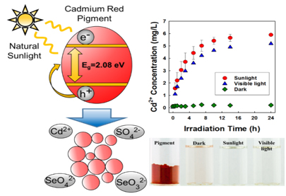 我院瞿晓磊副教授研究组针对镉系颜料的半导体特性,基于实际水环境条件,研究了商业镉系颜料由自然光照引发的镉释放过程及其反应机理。研究结果显示,由于光生空穴和颜料晶格间的反应,水体中的镉系颜料在光照下发生快速溶解。水化学条件可通过改变能带位置、竞争光生空穴、和惰化反应界面影响镉释放动力学。研究结果指出,天然环境中镉系颜料的镉溶出主要由其光蚀过程控制;同时镉释放过程快速且彻底,带来显著的环境风险。因此,目前使用的基于溶解平衡的安全限量标准无法准确地评估和管控镉系颜料的环境风险。